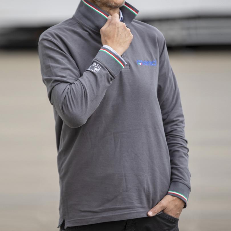 Logo stilizzato della Cisterna Mangime Menci ricamato in filo argentato, logo Menci ricamato in quadricomia sul petto e "M" di Menci ricamata, sempre in quadricomia, nel retro del colletto.