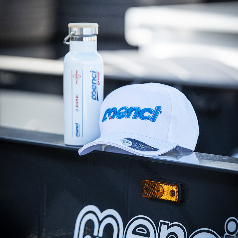 Set composto da una borraccia termica con applicato logo del Gruppo Menci in quadricomia e da un cappellino con applicato logo ricamato Menci in 3D.