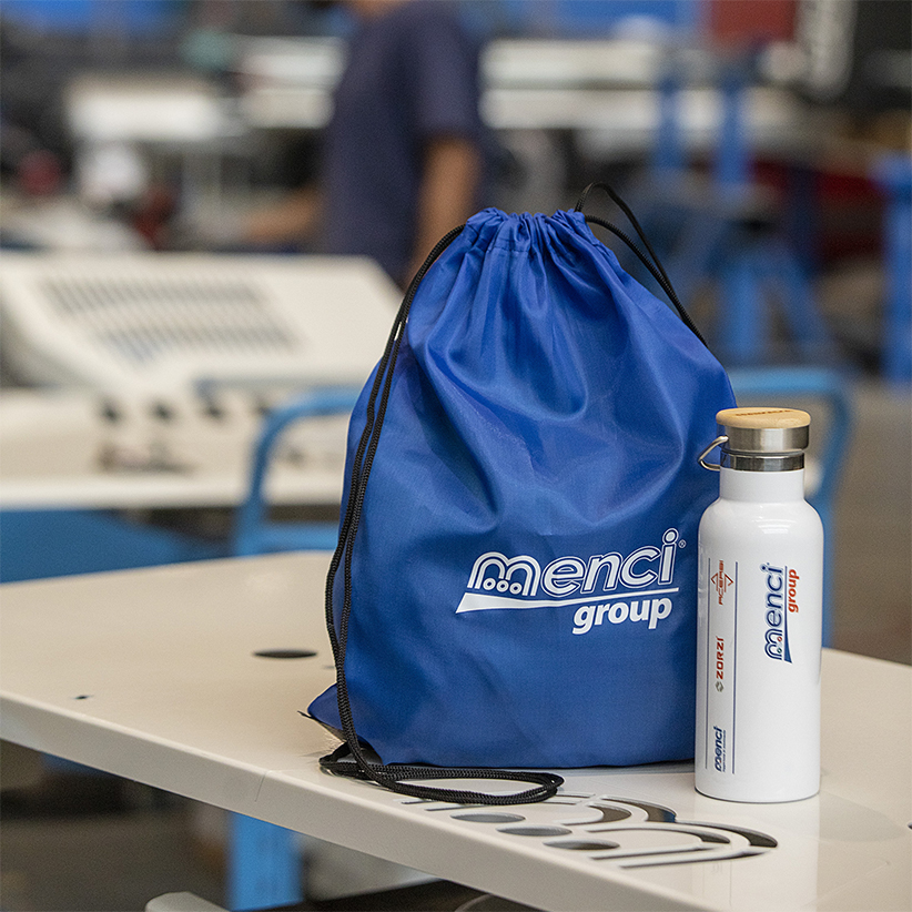 Set composto da una borraccia con applicato logo del Gruppo Menci in quadricomia e da uno zainetto triangolare blu con applicato logo bianco Menci Group.