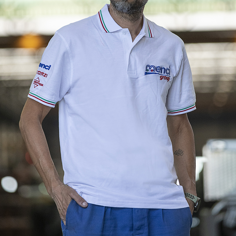 Polo a maniche corte bianca con fasce tricolore sulle maniche e loghi del Menci Group ricamati in quadricomia.