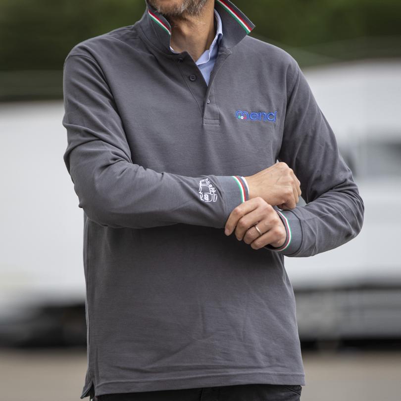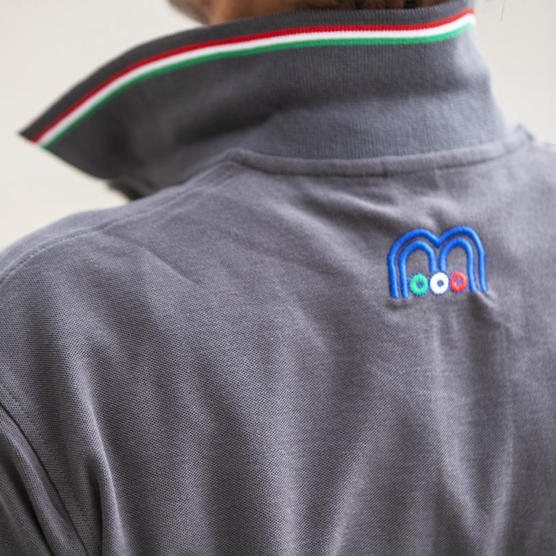 Logo stilizzato della Cisterna Mangime Menci ricamato in filo argentato, logo Menci ricamato in quadricomia sul petto e "M" di Menci ricamata, sempre in quadricomia, nel retro del colletto.